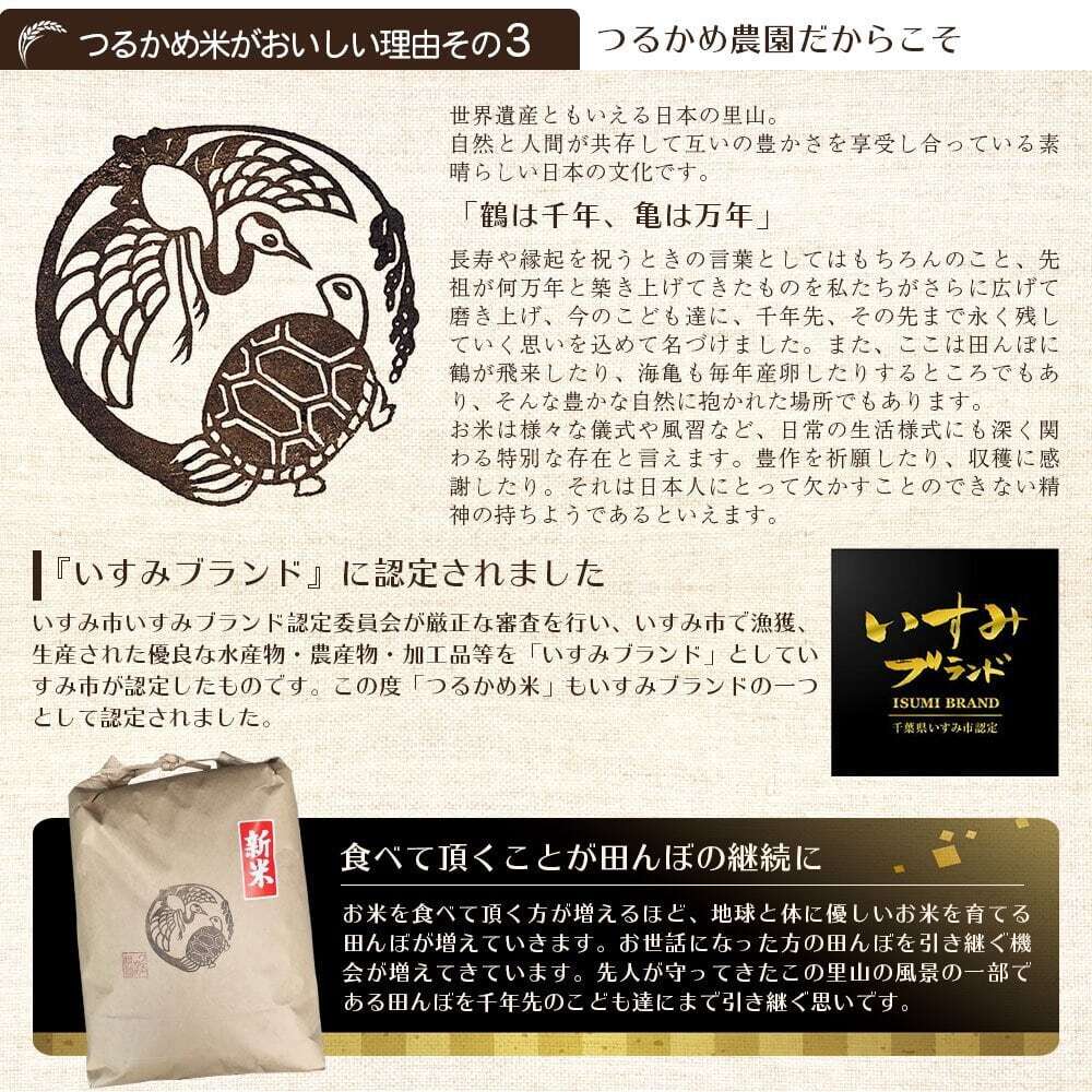 千葉県いすみ市の米農家である「つるかめ農園」から直接お客様へお届けします。つるかめ農園(https://www.tsurukamefarm.com)では、自然栽培(無農薬・無施肥)にこだわり、お米本来の力を引き出す栽培方法を実践しています。手間と時間をかけて育てられたカミアカリは、安心安全はもちろんのこと、深い味わいをお楽しみいただけます。